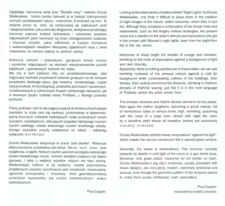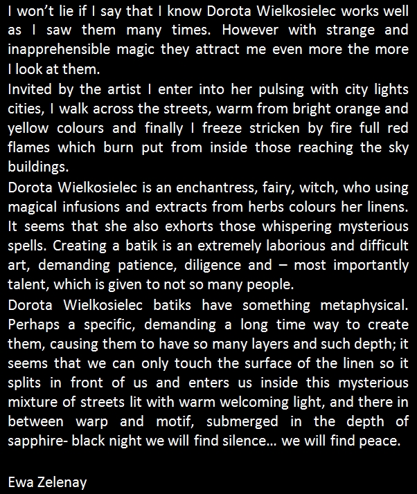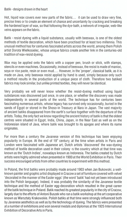 „NIGHT LIGHTS” – nocturnes and not onlyThere are two batiks. The first, a kind of „school” on paper using ink or water colours and paraffin candle and the second one – „classic batik” which came to Europe from Indonesia through India, Arabic countries, Spain and Holland.