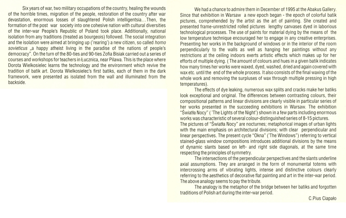 This exhibition of monumental batiks by Dorota Wielkosielec in the Museum of Textile Industry presents a choice of her works from the last seven years; from the cycle „Night Lights” (nocturnes), „Windows” (details of modern big city architecture), „Wings” (transformed metaphorically almost symmetric diptychs) and „Landscapes” (almost abstractive, taken straight from nature, shots of genuine nature). A mutual trait is the usage of the transparency of bright colourful cotton linen hung in space. With expression of colours and the act of the air batiks seem to take us into the interior of enormous cathedrals (stained glass windows, into the silence of contemplation over being and fate –