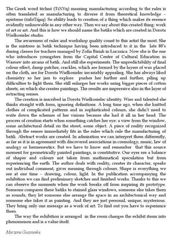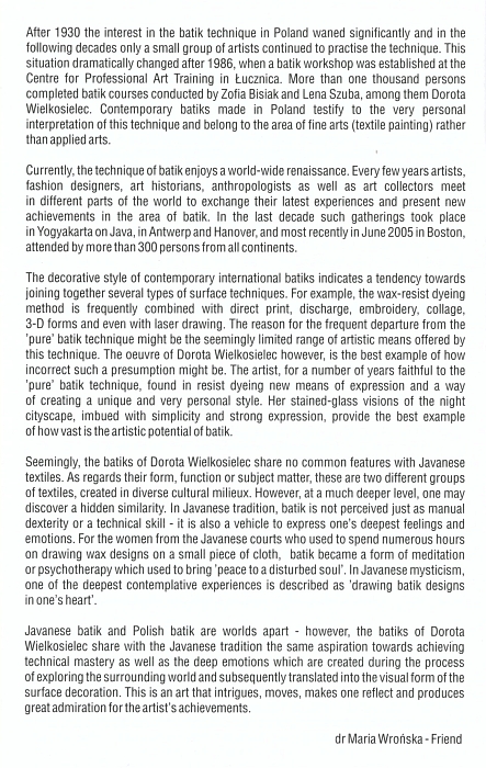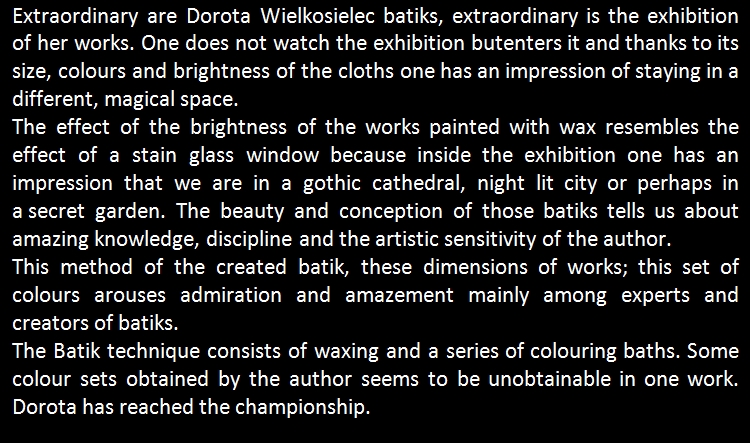 Dorota Wielkosielec is one of those few who consistently for many years has practiced batik in a creative way, on a big scale. In high rooms, like stained glass window, against the light, she often exhibits long batiks to extract all the possible advantages of the fabric. Its lightness, breathability, but not flimsiness like silk, she extracts from them transparent possibilities. The colour presented to the audience in such a way is bright, when in the context of cold and dark it uses „these tints”, bright greens, yellows, oranges or fantastic shades of pink or purple. She transforms white „sheet like” cotton linen into sharp, vivid, pulsing like vivid young muscles energized by oxygen like tissue of matter.